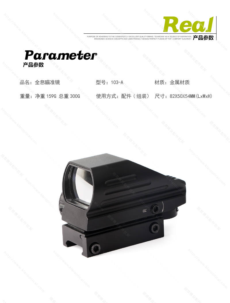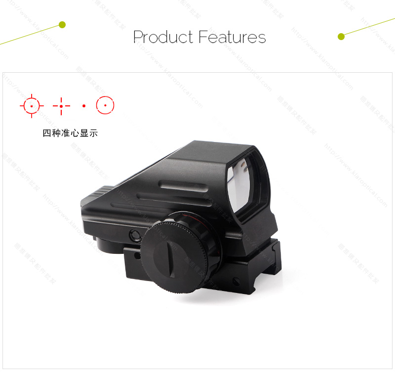 【產(chǎn)品名稱】:全息瞄準(zhǔn)器 【產(chǎn)品特點(diǎn)】:內(nèi)紅綠點(diǎn)隱形 【產(chǎn)品型號(hào)】:103A 【產(chǎn)品倍數(shù)】:1倍 【產(chǎn)品口徑】:22mm 【產(chǎn)品夾具】:20mm 【是否帶燈】:紅綠光【產(chǎn)品尺寸】:7CM左右 【產(chǎn)品材質(zhì)】:鋁合金 【產(chǎn)品顏色】:黑色 【分化圖像】:四變點(diǎn) 【夾具選配】:11mm窄。20mm寬 103A全息瞄準(zhǔn)鏡